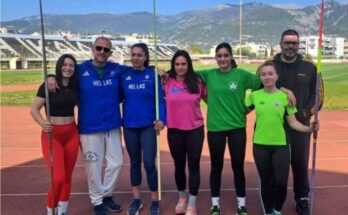 Ο ομοσπονδιακός προπονητής των ρίψεων Ντέμης Ματάκης με τις αθλήτριες του ακοντισμού Καλλιόπη Μεϊμάρη, Πολίνα …