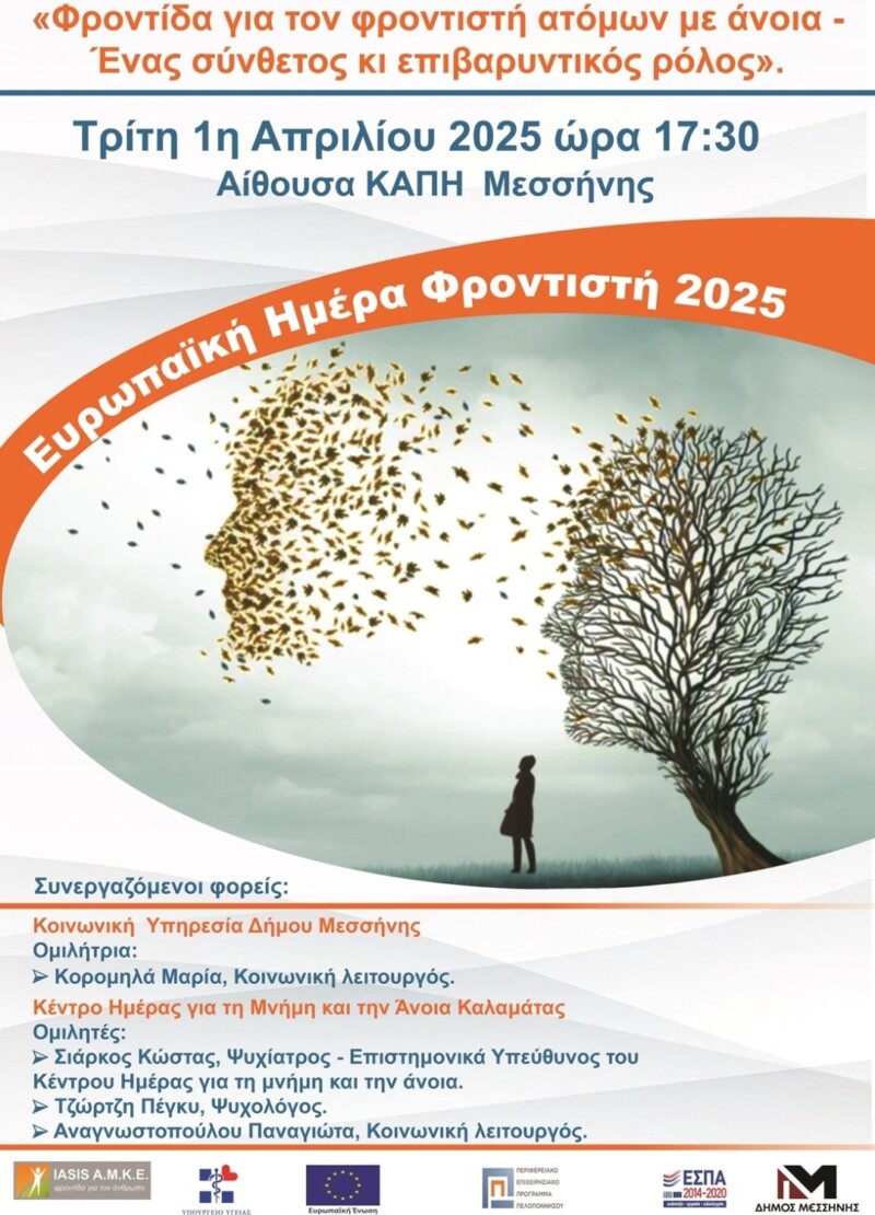 Δήμος Μεσσήνης, με αφορμή την Ευρωπαϊκή Ημέρα Φροντιστή, θα πραγματοποιήσει στο πλαίσιο των Προγραμμάτων Πρόληψης και Προαγωγής Υγείας εκδήλωση ενημέρωσης και ευαισθητοποίησης, για τους φροντιστές, την επιστημονική κοινότητα και το ευρύ κοινό την Τρίτη 1η Απριλίου 2025 και ώρα 17:30, στο ΚΑΠΗ Μεσσήνης.