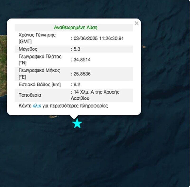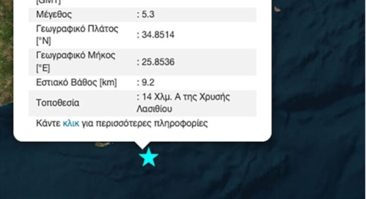Ο ΣΕΙΣΜΌΣ ΣΎΜΦΩΝΑ ΜΕ ΤΟ ΓΕΩΔΥΝΑΜΙΚΌ Ινστιτούτο είχε εστιακό βάθος 9,2 χιλιόμετρα και το επίκεντρο είναι 14 χιλιόμετρα ανοικτά της Χρυσής Λασιθίου στην θάλασσα.