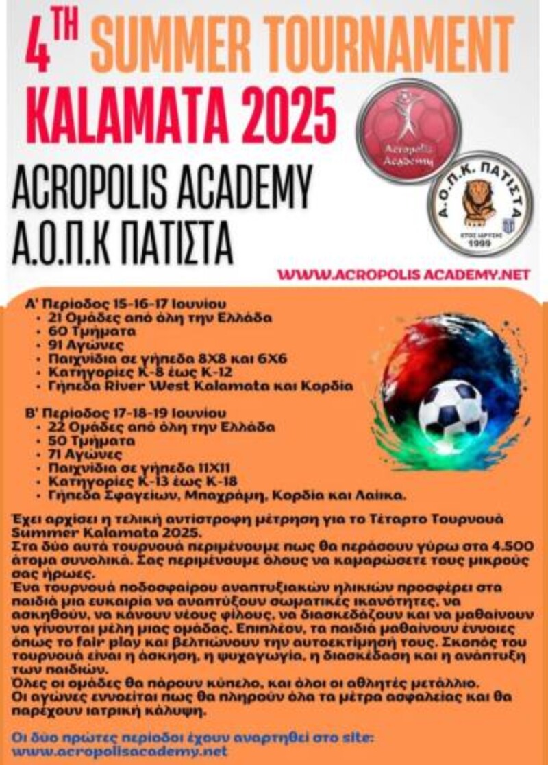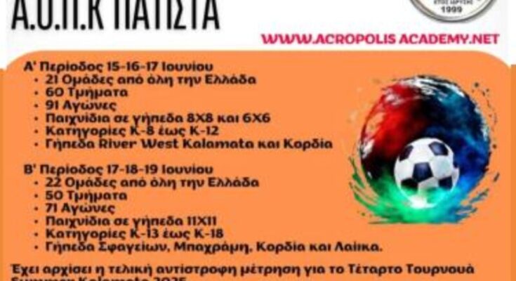 Η πόλη της Καλαμάτας ετοιμάζεται να υποδεχτεί για τέταρτη συνεχόμενη χρονιά το εντυπωσιακό ποδοσφαιρικό τουρνουά “Summer Tournament Kalamata 2025”, που διοργανώνεται από την Acropolis Academy και τον Α.Ο.Π.Κ. Πατίστα.