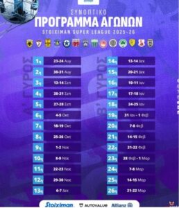 * Μετά την κλήρωση του πρωταθλήματος θα ανακοινωθεί το αναλυτικό πρόγραμμα αγώνων της κανονικής περιόδου του Πρωταθλήματος Stoiximan Super League 2025-26. (Sport24)